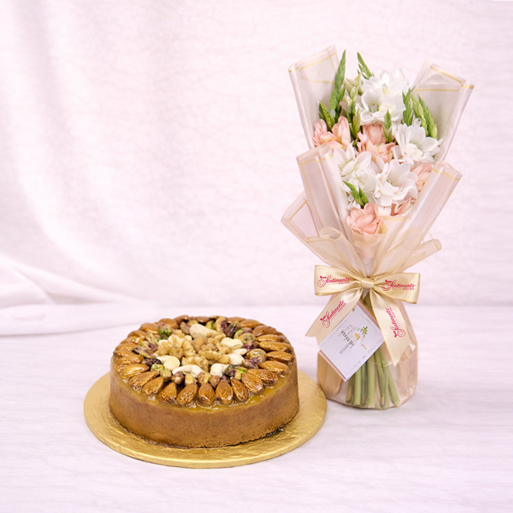 Dry fruit cake 1 Lb and pink pastel bouqet paired up to bring warmth for you.