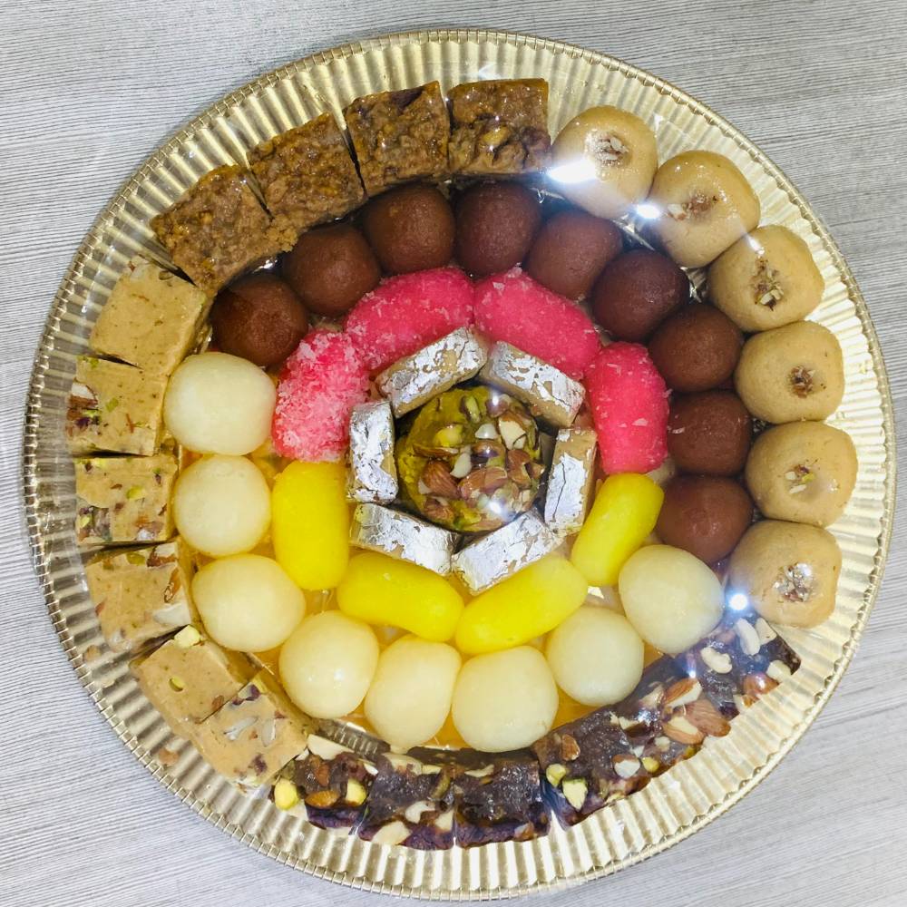 A generous round platter filled with a delightful mix of standard and premium mithai—perfect for festive tables, family gatherings, or thoughtful gifting. A colourful spread that offers something for every kind of sweet tooth, beautifully arranged and ready to serve.