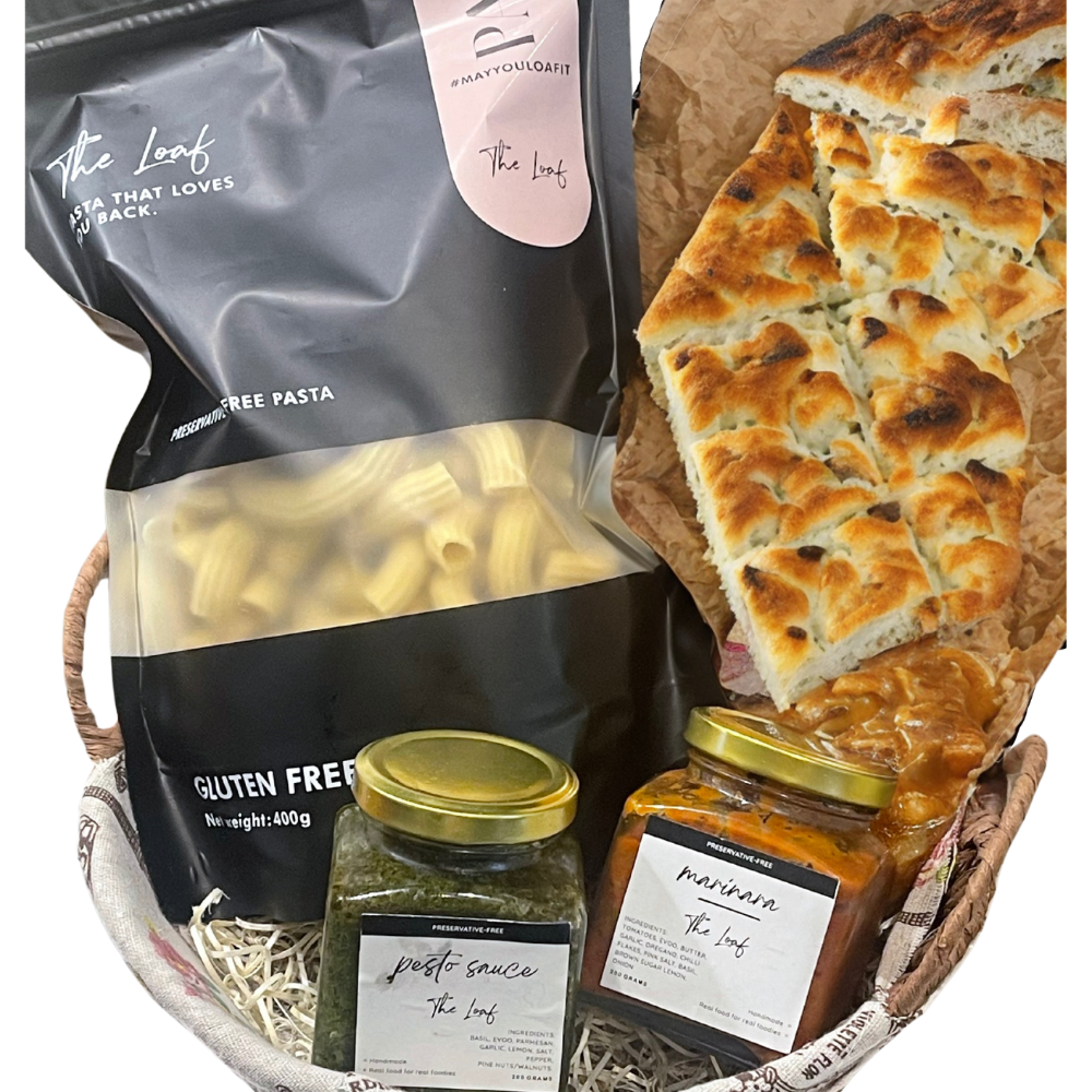 Savor the flavors of italy with our pasta night in basket, packed with a woven basket full of pasta, delightful pesto, hearty marinara, and warm focaccia.