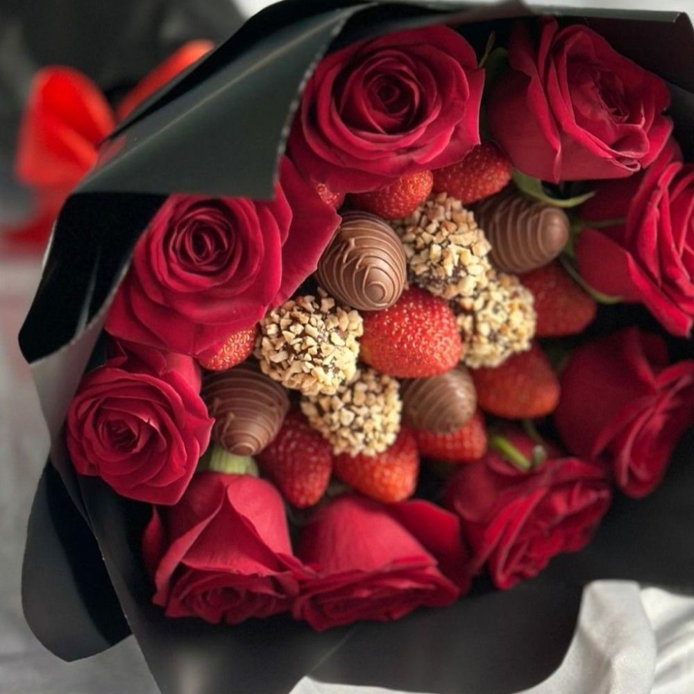 Make this Valentine's Day unforgettable with our stunning combination of romance and indulgence. This elegant bouquet features fresh roses paired with decadent chocolate-covered strawberries.