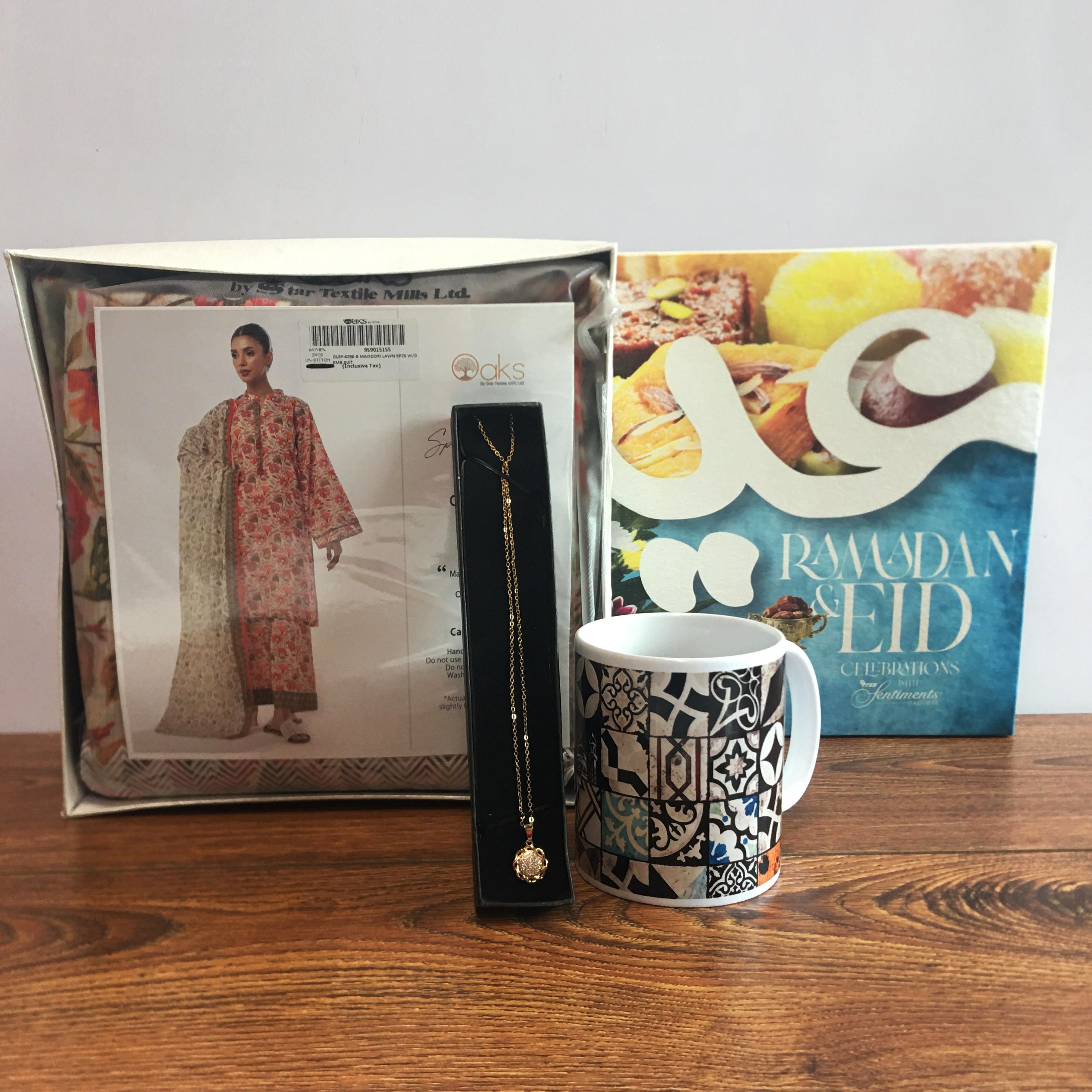 Welcome Ramadan in elegance with a stunning 3-piece suit, dazzling jewelry, and a beautifully crafted mug.